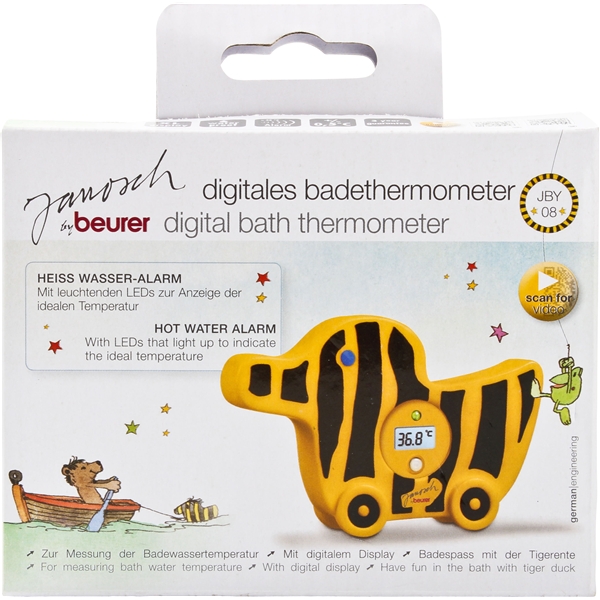 Digital badetermometer med innebyggd hetvannsalarm og lamper som indikerer grønt eller rødt avhengig av temperaturen. Även en digital display som visar den exakta temperaturen på badvattnet. Produkten er helt vanntät og kan brukas som badleksak.