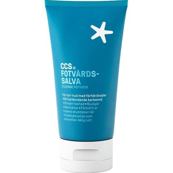 CCS Fotpleiesalve er spesielt utviklet for tørre føtter med hard hud. Inneholder 10% fuktighetsbindende karbamid og har 3 funksjoner i 1; mykgjør, fukter og forbedrer hudens beskyttelsesbarriere. I tillegg inneholder den eukalyptusolje som motvirker dårlig lukt og gir en frisk duft. Resultatet blir myke, smidige og velduftende føtter.