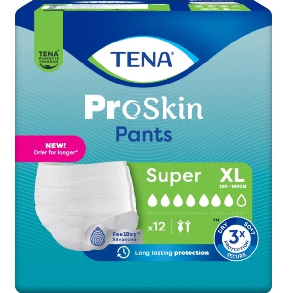TENA Pants Super er buksebeskyttelse som gir deg opptil 100∘% sikkerhet ved middels til store urinlekkasjer. De har rask absorpsjonsevne og holder huden tørr lenge, både dag og natt. Disse engangsbeskyttelsene passer en aktiv livsstil og kan brukes av både kvinner og menn.