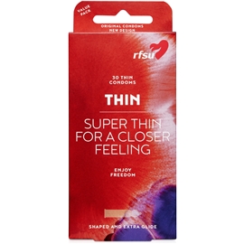 RFSU Thin er tynne kondomer for en nærere følelse, nesten som uten. Thin er for alle som synes att en ekstra tynn kondom er en bedre kondom. Ufarget, profilert latekskondom med slett overflate, beholder og glidemiddel. Bredde 53 mm.