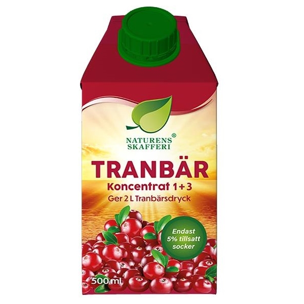 Naturens Skafferi tranebærkonsentrat 1+3, inneholder bare 5% tilsatt sukker og har et tranebærinnhold på hele 23% (blandet i tråd med angitt dosering).Spes 1 del konsentrat + 3 deler vann=1 liter drikkeklar tranebærdrikk. Pasteurisert. Tips! Konsentratet kan utmerket fryses i isbitbrett (fungerer ikke i pose) og tas fram når man vil blande et glass tranebærdrikke.Oppbevaring: Åpnet forpakning skal oppbevares i kjøleskap og konsumeres i løpet av 8 dager. Uåpnet forpakning kan oppbevares i romstemperatur.