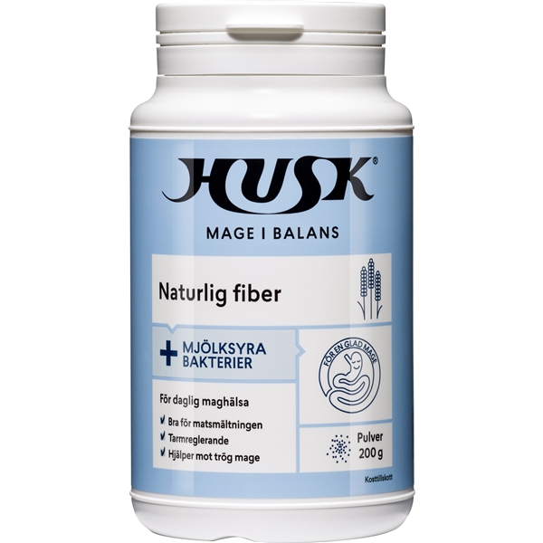 Husk med psylliumfibre, melkesyrebakterier og inulin. Bidrar til en normal fordøyelse, ved treg eller løs mage. Husk inneholder naturlige fibre fra psyllium, som hjelper til å opprettholde normal fordøyelse – eksempelvis ved treg eller løs mage. Husk tilbys i pulverform, kapsler og i porsjonsposer, og har en nøytral smak for enkel bruk i kalde drikker og retter (vann, juice, yoghurt etc).