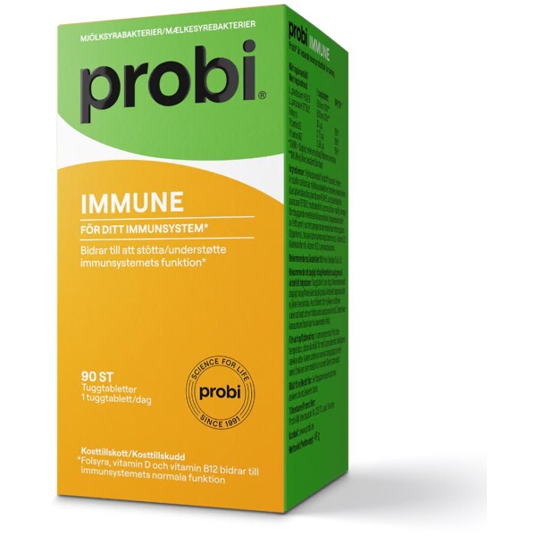 Probi® Immune inneholder to patenterte og veldokumenterte melkesyrebakteriestammer, vitamin D, folsyre og vitamin B12. Produktet bidrar til et velfungerende immunsystem. De to bakteriestammene heter Lactiplantibacillus plantarum HEAL9 (HEAL9®) og Lacticaseibacillus paracasei 8700:2 (L. Paracasei 8700:2®).