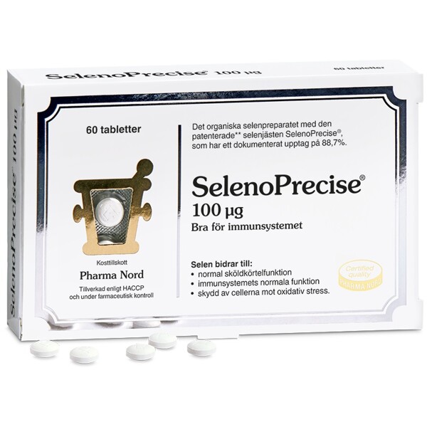 SelenoPrecise er små, runde hvite tabletter med 100 mikrogram selen i form av Pharma Nords patenterte selen-gjær. Inneholder biotilgjengelig organisk selenometionin og mer enn 20 andre organisk bundne selenforbindelser. Preparatet er unikt fordi dets innhold av ulike organiske selenforbindelser ligner den naturlige variasjonen av selen som vi får i oss fra selenrik mat. Selen bidrar til normal funksjon av immunsystemet og skjoldbruskkjertelen samt til å opprettholde normalt hår og negler. Egnet for veganere og vegetarianere.