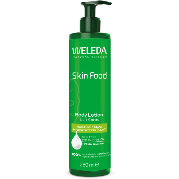 Raskt absorberende og nærende body lotion for intensiv pleie og langvarig fuktighet. Beriket med den unike SKIN FOOD PHYTO INFUSION, som inneholder ekstrakt av kamille, ringblomst, rosmarin og stemorsblomst. Lotionen gir en naturlig glød umiddelbart etter påføring. Med phyto-squalane styrkes hudbarrieren samtidig som den behagelige teksturen gjør huden myk og smidig – selv veldig tørr hud føles fuktet og balansert. Dermatologisk testet.