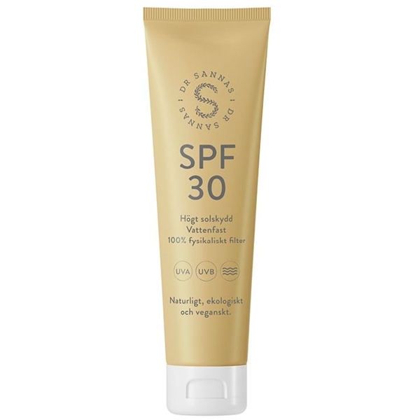 Dr Sannas SPF 30 er naturlig, økologisk og dermatologisk testet. Det er en vannfast, fysikalsk mineralbasert solbeskyttelse med zinkoksid som reflekterer bort de skadelige UVA- og UVB-strålene fra solen og inneholder ingen allergener. Vegansk og ikke testet på dyr.