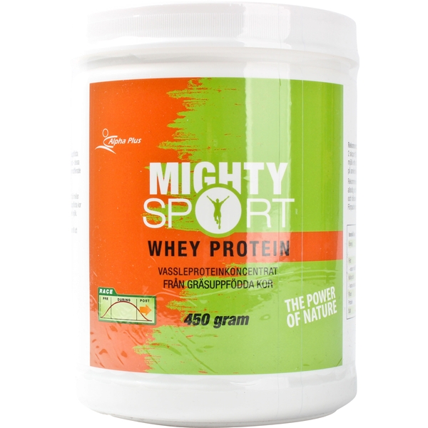Mighty Sport Whey Protein er et rent, konsentrert myseprotein.Intensiv fysisk trening øker kroppens behov for næringsstoffer, bl. a. protein: kroppen trenger protein for å reparere og bygge opp nytt muskelvev etter trening.Et daglig inntak på drøyt to gram protein per kg kroppsvekt er til fordel for personer som trener hardt.Mighty Sport Whey Protein har høy biotilgjengelighet og tas raskt opp. Myseprotein har høy konsentrasjon av grenkjedede aminosyrer (BCAA), som er svært konsentrerte i muskelvev. Disse aminosyrene brukes også som drivstoff for arbeidende muskler.Mighty Sport Whey Protein fremstilles av melk fra kyr som ikke er behandlet med steroidhormoner, veksthormoner eller antibiotika. Proteinet er fritt for denaturerte proteiner.