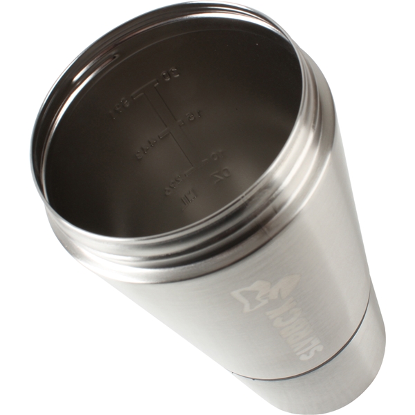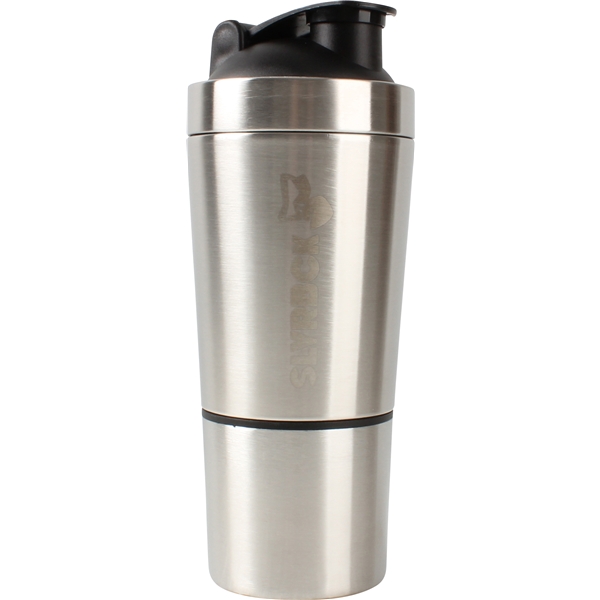 Shaker i 18-8 rustfritt stål med lokk i BPA-fri plast og pulverbeholder som kan skrus av nederst på shakeren.SLVRBCK-shakeren er luktfri, også når den blir gjenglemt i treningsbagen. Enkel å rengjøre.Shakeren har plass til 700 ml og kommer med en løstagbar pulverbeholder med plass til 200 ml. Lokket er sikret og har en flip-cap som holder shakeren tett. Et spiralfilter i lokket løser opp eventuelle klumper.
