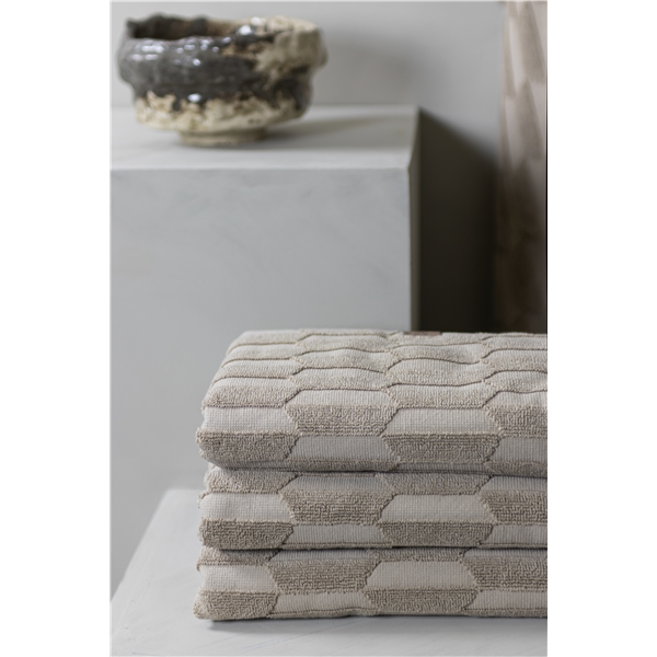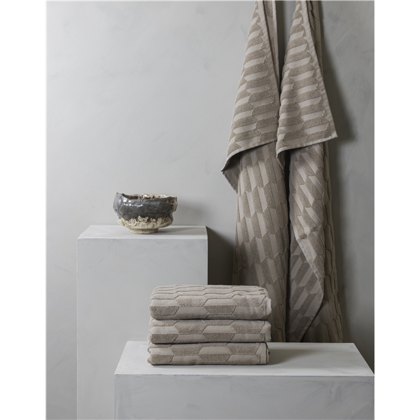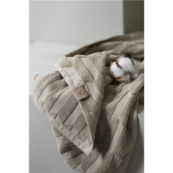 Geo badehåndkle 70x133 cm fra Mette Ditmer. Mette Ditmer-serien Geo er laget med en spesiell veveteknikk som skaper et nesten tredimensjonalt mønster. Badehåndkleet er fordelaktig matchet med de mindre håndklærne og baderomsmattan fra samme serie for å få et ensartet inntrykk på badet eller på toalettet. Håndkleet er laget av 100% EcoTex-sertifisert bomull som gir enestående mykhet og god absorberingsevne. Finnes i flere farger.