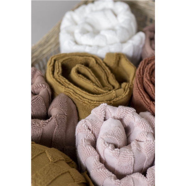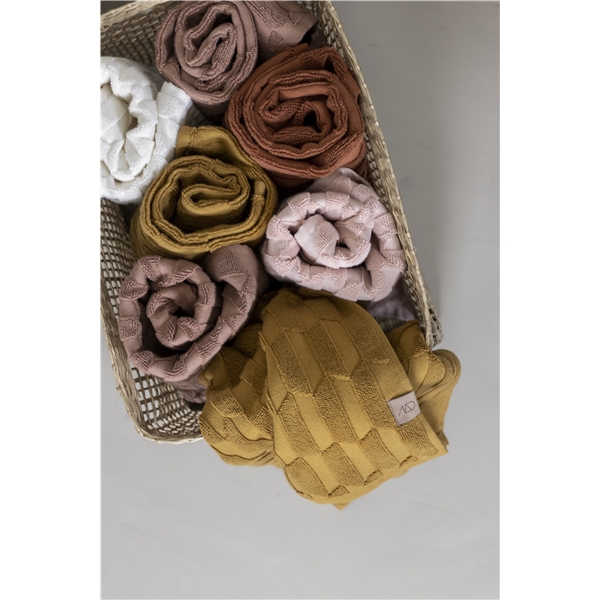 Minihåndklær fra Mette Ditmer i 3-pakning. Håndklærne fra Geo-serien er praktiske og har mange bruksområder. Blant annet er de perfekte på badet for gjester å tørke hendene med sitt eget tørre og friske håndkle uten bakterier på. Eller bruk håndkleet som et ansiktshåndkle / vaskeklut for morgen- eller kveldsrutinen. I tillegg til å være praktisk, er de små håndklær veldig vakre å ha i en kurv eller på et brett, på vasken eller på badet. Det vakre tredimensjonale mønsteret er unikt og veldig fint. Kombiner med de større håndklærne og baderomsteppet fra samme serie.