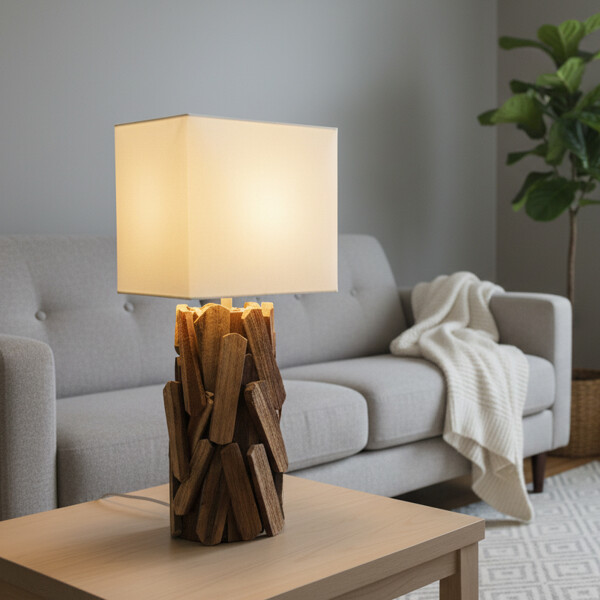 Lys opp ditt hjem med den rustikke sjarmen og den kunstneriske designen til denne håndlagde bordlampen i teaktre. Omtankevis satt sammen av naturlige teaktrebiter og toppet med en strukturert, sydd lampeskjerm av stoff, sprer denne lampen et organisk, varmt lys i ethvert rom. 100 % håndlaget i Thailand, er den et bevis på bærekraftig håndverk og tilfører både belysning og en unik dekorativ følelse. Størrelse: Omtrent 20 x 20 x 53 cm Materiale: Naturlig teaktrebase med strukturert stoffskjerm. Håndlaget Kvalitet: Hver lampe er 100 % håndlaget og viser det intrikate arbeidet med å sette sammen naturlige treelementer. En unikt designet belysning fra Thailand.Unik Design: Har en distinkt base skapt av sammenkoblede teaktrebiter, komplettert med en ren, rektangulær stoffskjerm.