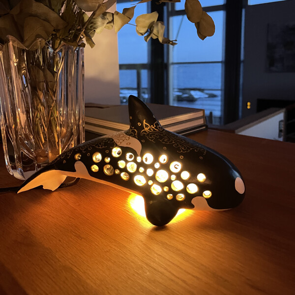 Gi hjemmet ditt et preg av havet med vår fantastiske håndlagde Orka-lampe. Omsorgsfullt laget i Thailand av resirkulerte papirkjerner, har dette bemerkelsesverdige stykket intrikate, håndmalte thailandske motiver inspirert av den utsøkte tradisjonelle Benjarong-kunsten. Designet for å avgi et varmt, omgivende lys, fungerer denne lampen ikke bare som et vakkert dekorativt midtpunkt, men tilfører også et snev av bærekraftig eleganse til omgivelsene dine. Størrelse: Omtrent 12 x 24 x 13,5 cm. Materiale: Papir-maché av resirkulert papir, fremmer bærekraftig innredning. Håndmalt med detaljerte thailandske mønstre, som gir den en unik kunstnerisk touch. Den slående orkaformen forener kraftfull design med funksjonell belysning, og skaper et fengslende fokuspunkt i ethvert rom. Lett å rengjøre med en fuktig klut.