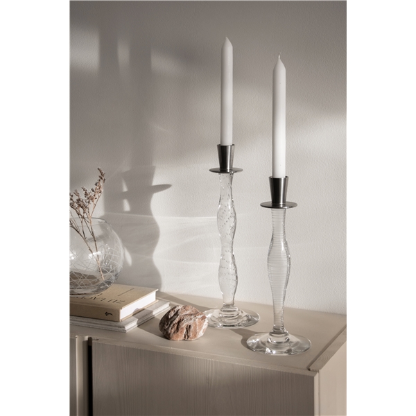 Design: Anne Nilsson En oppgradert klassiker!Ny versjon av den populære lysestaken Celeste, kombineres det håndformede, kurvete glasset med rustfritt stål for et mer moderne uttrykk. Tøft og elegant på samme tid. Vær lysestake har fått en egen, unik stil med dekor som er gravert, sandblåst eller håndmalt. Like, men også ulike – en stilfull gruppe sammen. Material: Glass.Størrelse:Lysestake Lines/Linjer: Høyde 29 cm Diameter: 10,5 cm.Lysestake Bubbles/Bobler: Høyde 33 cm Diameter: 11 cm.Lysestake Cut/Skjær: Høyde 37 cm Diameter: 11,5 cm.Lysestake Stripes/Strek: Høyde 41 cm Diameter: 12 cm.