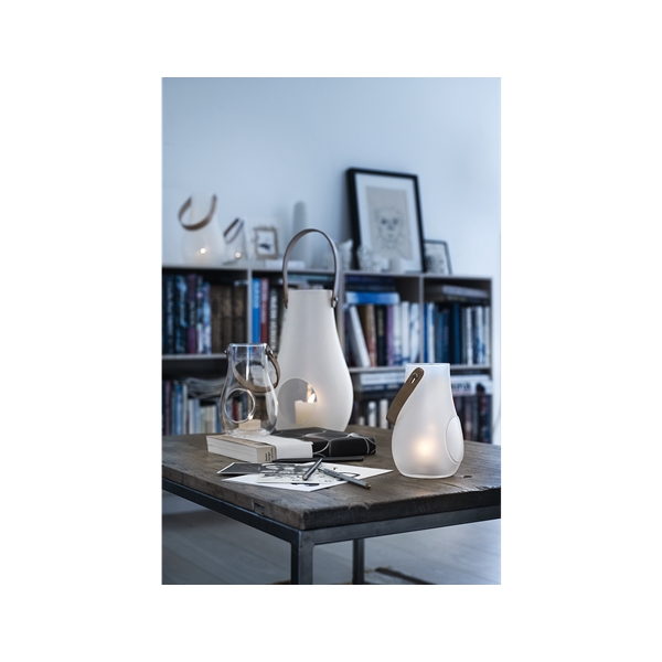 Bruk lanternen året rundt. På sommerkvelder på terassen, som dekorasjon på trappen som en velkomst til gjestene dine – eller som en elegant juledekorasjon med noen kuler, granris og kanelstenger i bunnen. Maria Berntsen har skapt denne mobile lyskilden av glass og lær, som sprer stemning i skandinavisk stil. Denne gulvlanternen er 45 cm høy. Det finnes også en liten versjon på 16 cm, en mellomversjon på 24,8 cm og en stor versjon på 29 cm. Lanternene finnes både i blankt og frostet glass, og er vakre å kombinere. En fin presang til et spesielt tilfelle.Design: Maria Berntsen.Material: Munnblåst glass og lær.Maria Berntsen Design med lyslykter i transparent og frostet glass, er skapte for å kaste et spesielt lys over alle miljøer – hvor som helst. Med sitt glass og lær, har sortimentet en ren skandinavisk stil, og fungerer som en mobil lyskilde året rundt. Lyktene kan brukes på uteplassen på lange sommernetter, i vinduet, på gulvet, eller som bordsdekorasjon. Design med lys er som skapt for både friluftsliv og for å skape en fin atmosfære utendørs – men de bør oppbevares innendørs for å beskytte lærhåndtaket. Den runde åpningen er håndlaget av Holmegaards erfarne håndverkere, noe som gjør hver lykt unik.