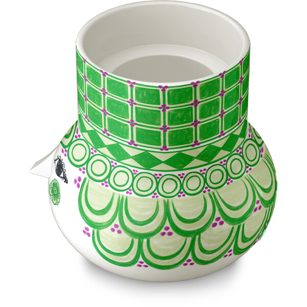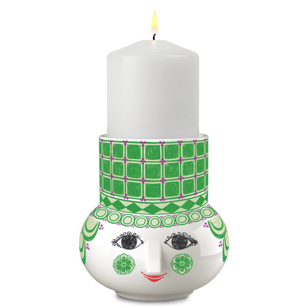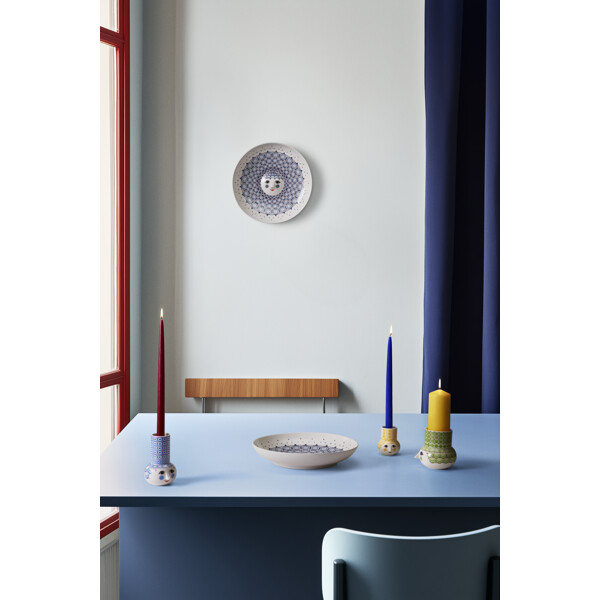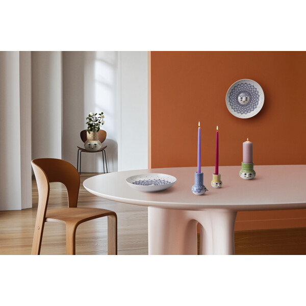 Vik ut din fargerike personlighet og skap plass for glede med Bjørn Wiinblads Olga. Med sitt søte smil, fargerike kinn og karakteristiske dekorasjoner legemliggjør Olga selve essensen av Bjørn Wiinblad som person og kunstner – selv når hun tar form som en lysestake. Glad og drømmende sprer hun liv og personlighet i interiøret med sitt poetiske uttrykk og sine livlige farger. Olga-lysestaken har samme runde form og sylindriske topp som vasene i Olga-serien, som så dagens lys i 2024 som en nytolkning av en ikonisk vase fra Bjørn Wiinblads imponerende designarkiv. Lysestaken prydes av et søtt rundt ansikt med mandelformede øyne og den ikoniske trekantede nesen – nesten selve personifiseringen av Bjørn Wiinblads kunst. Denne store lysestaken i serien, som passer både telys, kronelys og blokklys, er 12 cm høy og spraker av farge i en klar lysegrønn nyanse med lilla prikker. Alle Olga-lysestaker er laget av blankglasert keramikk med fargerike dekaler, og dekorasjonene er en fantastisk blanding av originalmønstre fra Bjørn Wiinblad, presentert i en variert fargepalett som gir et moderne og friskt uttrykk. Bjørn Wiinblad var en livsglad kunstner med en stor og fargerik personlighet, som gikk sin egen vei og ikke var redd for å drømme stort. Den sjelen lever videre i Olga, som utstråler selvtillit og inspirerer oss til å uttrykke vår egen stil og personlighet gjennom dekorasjoner inspirert av Bjørn Wiinblads originalkunstverk. En ting er sikkert: Det blir aldri kjedelig når Olga flytter inn.