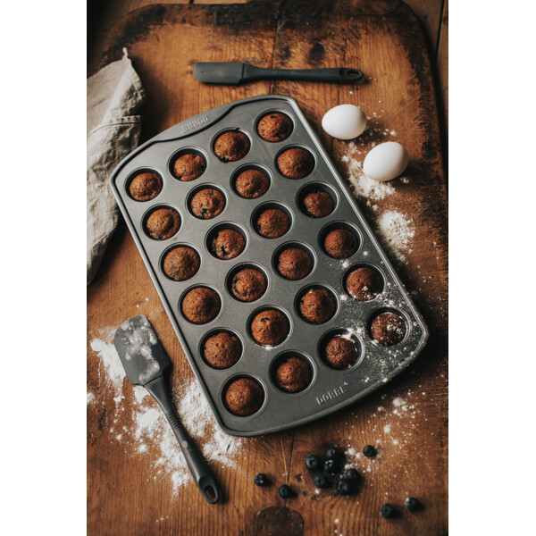 Praktisk muffinsform for baking av mini-muffins og cupcakes. Laget i slitesterkt karbonstål, fri for PTFE, PFOA og BPA. Gir jevn steking og enkel rengjøring. Perfekt for både hverdagskaffe og festlige anledninger.