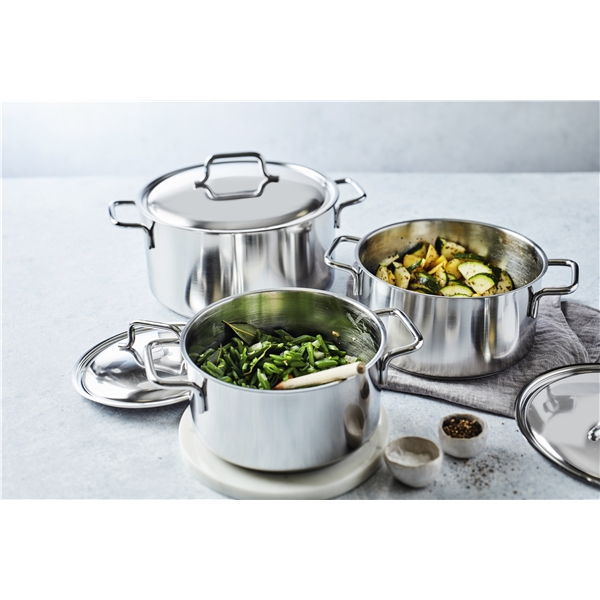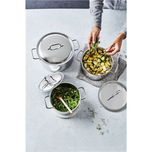 Gryte av høy kvalitet med lokk fra Apollo-serien fra Demeyere. Den gryte i rustfritt stål er utstyrt med TriplInduc og InductoBase bunner. TriplInduc -teknologien betyr at kjelen forblir flat og fører til 30% høyere effektivitet på induksjonskokere og InductoBase-bunnen på 7 lag aluminium gir jevn og effektiv varmefordeling. Den matte overflaten i Silvinox gjør gryten lett å holde ren og hygienisk.
