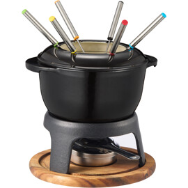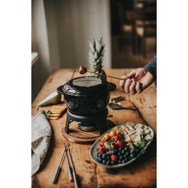 Fonda fondue i solid støpejern med en vakker treplate i akasietre lar deg nyte en koselig middag med familie og venner.