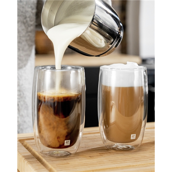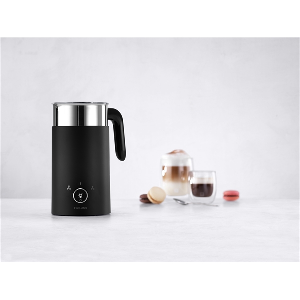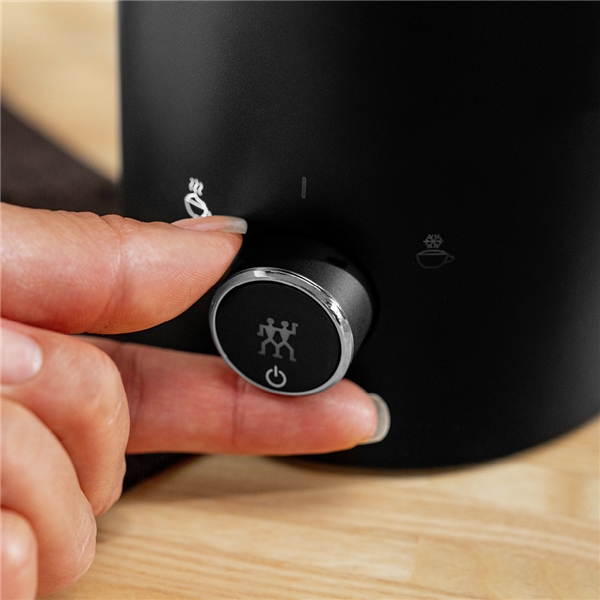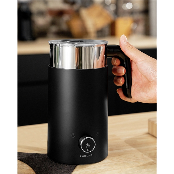 Med ZWILLING ENFINIGY-melkeskummeren oppnår du baristakvalitet selv i ditt eget hjem. Med et tastetrykk kan du varme opp til 200 ml varm eller 400 ml kald melkedrikk. ZWILLING ENFINIGY melkeskummer skummer også urtemelkalternativer som soya- eller ertemelk. For rengjøring: fjern enkelt melkebeholderen i rustfritt stål og fjern eventuelle melkerester. Effektinngang: 600 W Spenning: 220-240 V
