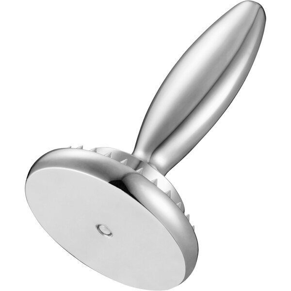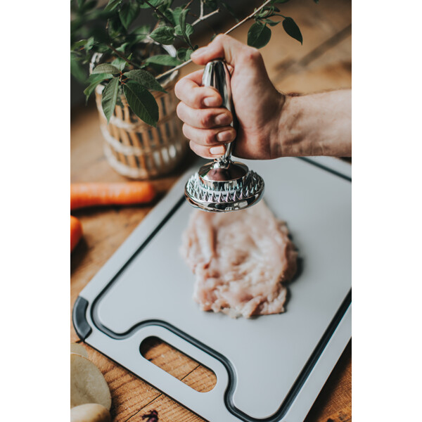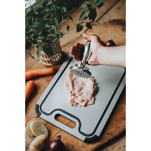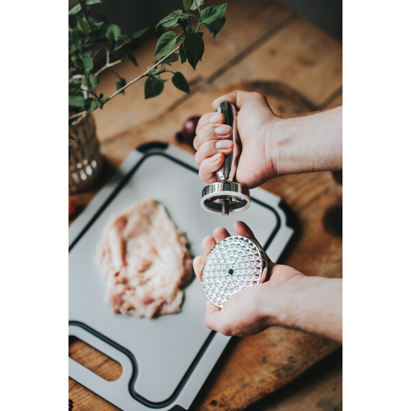 Praktisk kjøttbanker med to funksjoner: den ene siden med pigger for å mørne kjøtt og den andre helt flat for å jevne ut kjøttstykker. Laget i slitesterkt rustfritt stål med et komfortabelt grep. Et uunnværlig redskap for perfekt tilberedning.