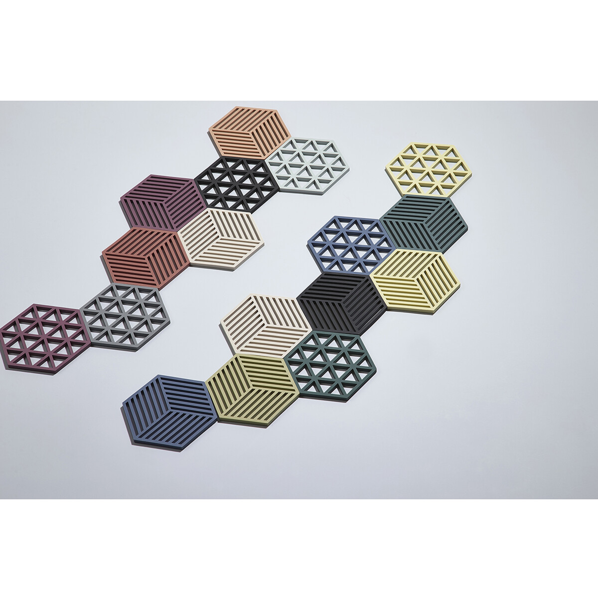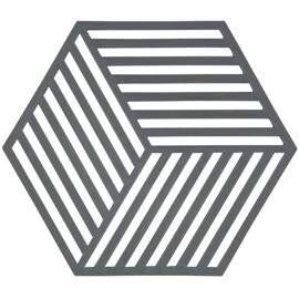 Hexagon gryteunderlagene i silikon er så grafisk dekorative at de inviterer til å plassere flere stykker langs hele bordets lengde uten å sette noe på dem. De er varmebestandige opp til 250 °C og kan vaskes i oppvaskmaskin. 16 x 14 x 0,9 cm.