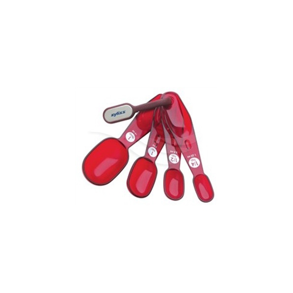 Praktisk sett med fire kryddermål i ulike størrelser fra Zyliss: 1spiseskje, 1tesskje, ½teskje, ¼teskje. Takket være en avlang form på målene når de også ned i de minste boksene.