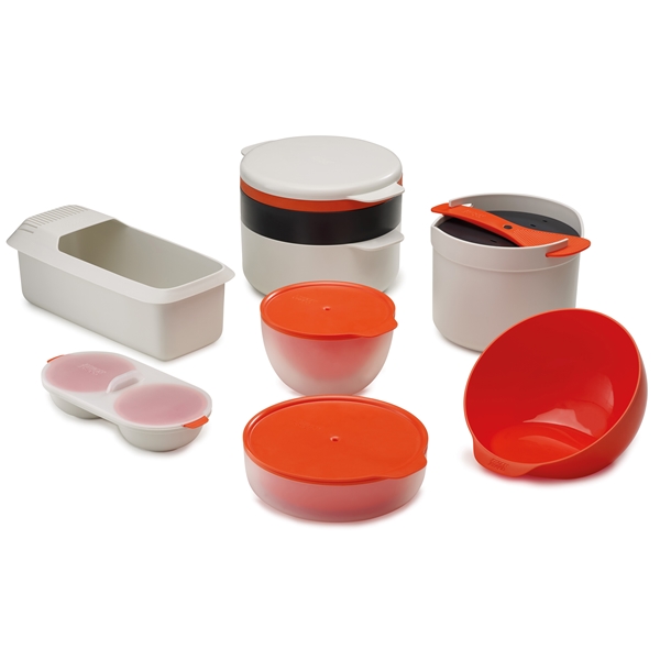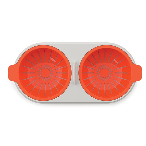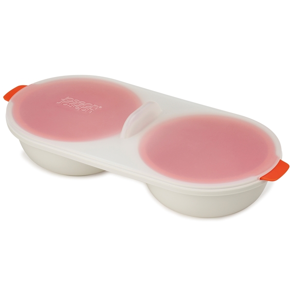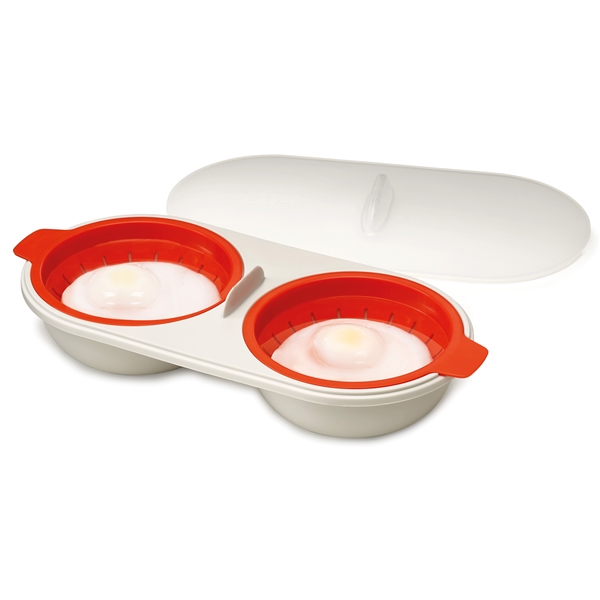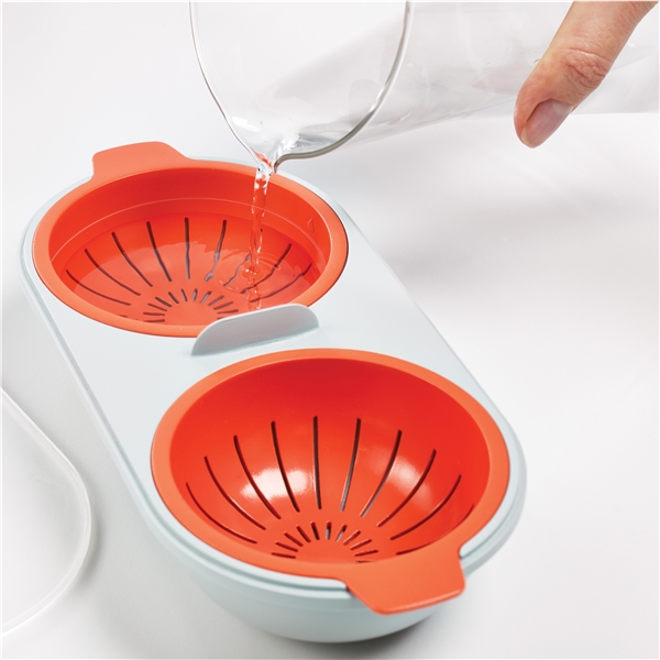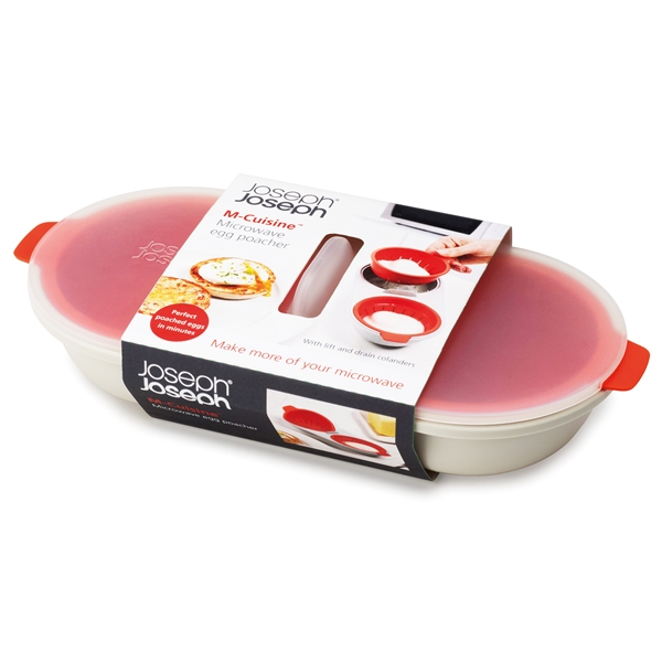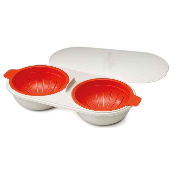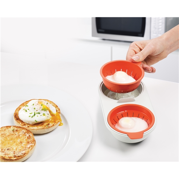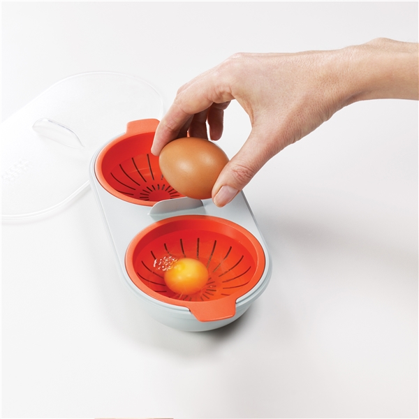 M-Cuisine er en serie med svært funksjonelle kjøkkenredskaper, som gjør at du enkelt kan lage lekker hjemmelaget mat i mikrobølgeovnen. Alle produktene i sortimentet er utformet med tanke på at det skal være bekvemt å lage hjemmelaget mat i mikrobølgeovnen, og dette gjenspeiles i forskjellige funksjoner.Med M-Cuisine ™ kan du nyte alt fra et enkelt pochert egg opp til et komplett familiemåltid.Fleksibilitet er en viktig fordel med dette staplingsbare tilberedelsesettet for mikrobølgeovner. Med sine fire utskiftningsbare deler, gjør dette flersidige designet at du kan lage alt fra én enkelt matrett, opp til et helt måltid slik at alt er klart samtidig. Å tilberede et perfekt pochetert egg i en panne kan være en vanskelig oppgave, men å tillberede det i vann gir ofte det beste resultatet. Nå kan du raskt og enkelt lage et pochetert egg i mikroen med dette gjennomtenkte produktet.Først fyller du hver del med vann opp til markeringen, deretter knekker du ett egg i hver skål. Sett på lokket og sett den inn i mikrobølgeovnen på full effekt under oppgitt tid. For å servere løfter du opp hvert egg med hjelp av det integrerte dørslaget.