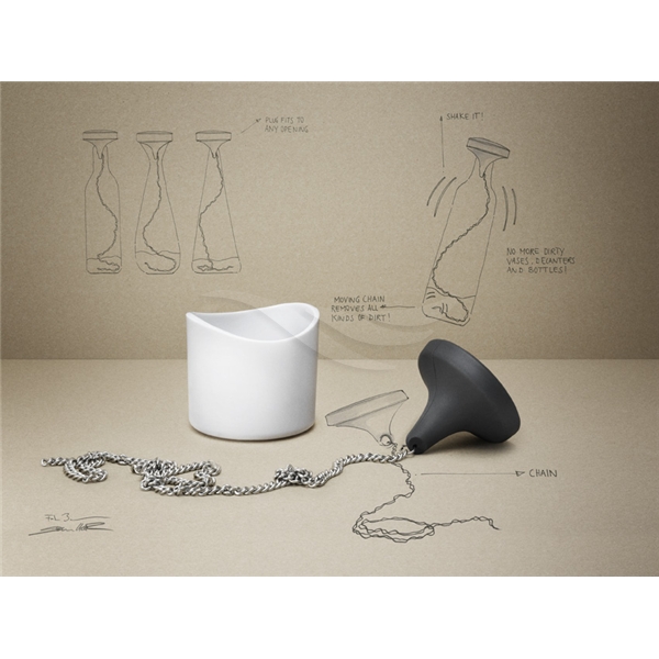 Dette er innovasjon, funksjon og design når det er på sitt beste. Ingen kalkavleiringer i dine karafler eller vaser! Du kommer ikke til å tro det før du har sett det! Fyll kannen med vann og oppvaskmiddel - ingen andre kjemikalier, still kjeden i vannet og rist karaffelen. Kjeden vil løse opp kalsium uten å skade glasset. Ingen riper - bare rent glass! Karaffelrenseren kommer i en vakker og elegant holder. Design: Formfjord. Materiale: Silikon, PC (plast), rustfritt stål.Bredde: 6,5 cm.Høyde: 5,8 cm.Farge: Sheer Hvit, Heavy Grå, True Black.