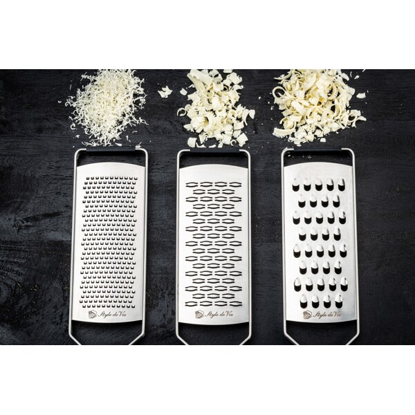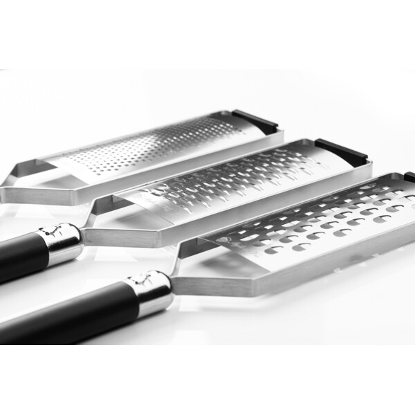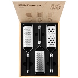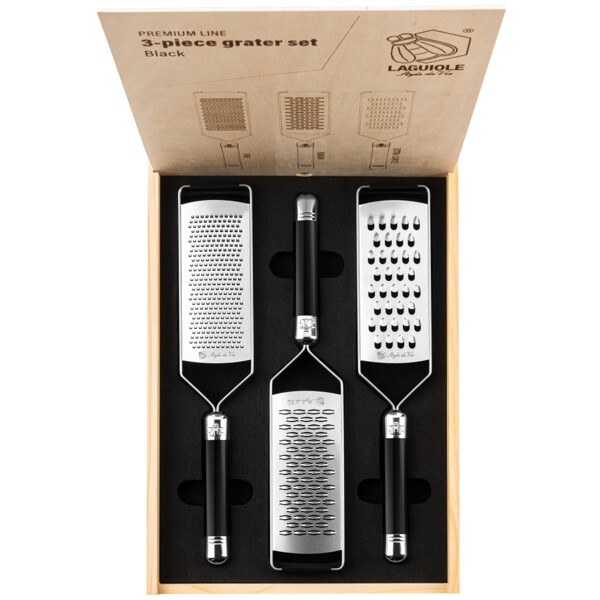 Et sett med 3 deler fra Laguiole Style de Vie. Hvert rivjern har sin egen funksjon, noe som gjør dette settet svært allsidig. Det fine rivjernet brukes for eksempel til sitrus, sjokolade, harde oster og krydder, mens det ekstra grove rivjernet passer best til poteter, kål, agurk, gresskar, ost, pølse og eple. Båndvarianten er ideell for å rive krydder, sitrus, ost, ingefær, kokos og sjokolade. Alle tre rivjernene har en laserskåret bladoverflate i rustfritt stål. Rivjernene er skåret med laserteknologi, noe som sikrer at rivjernene er svært skarpe. Berik din kulinariske repertoar med dette svært funksjonelle 3-delte rivjernsettet! Perfeksjon begynner med å bruke riktig verktøy! Pakket i en elegant trekasse, noe som gjør dette settet også flott å gi bort som gave.