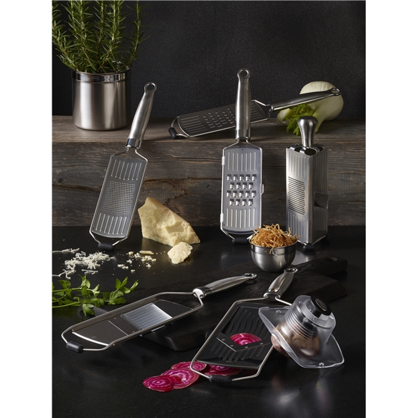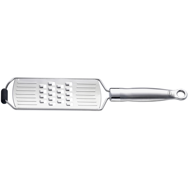 Rösle rivjern med håndtak, laget utelukkende av rustfritt stål. Det ergonomisk formede håndtaket ligger stødig i hånden og har dessuten en praktisk krok for oppheng. Perfekt for hard ost, for eksempel parmesan for en fullendt pastarett, til krydder, sjokolade eller ingefær når du skal bake. Rivjernets spesialformede tenner gir rask riving med minimal innsats. Finnes i forskjellige varianter.
