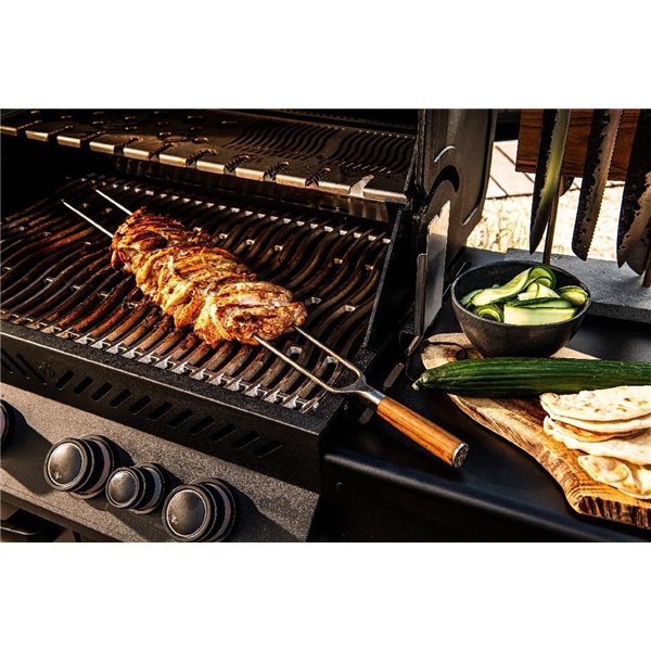 Gaffelspydet er laget av stål av høy kvalitet. Håndtaket har en rund til oval form og er laget av oliventre. Dette gjør den veldig behagelig å holde i. Takket være dens skarpe spisser kan du enkelt tre et hvilket som helst kjøttstykke, grønnsak eller frukt på gaffelen din, og den høye kvaliteten på spydene sørger for at de holder seg godt på plass under grilling og servering.< /p >