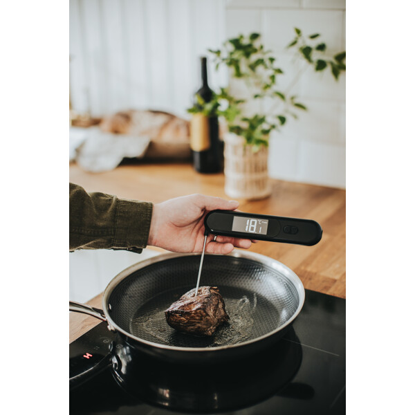 Praktisk 2-i-1 termometer med infrarød funksjon for overflatetemperatur og stikk for innvendig temperatur. Gir rask og nøyaktig måling ved matlaging, grilling og baking. Perfekt for deg som vil ha full kontroll på temperaturen på kjøkkenet.