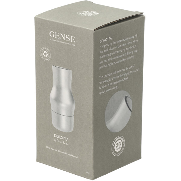 Dorotea-kvernene er laget av resirkulert rustfritt stål. Det betyr at det rustfrie stålet har levd et tidligere liv, som man pleier å si. Foruten at det er ekstremt slitesterkt, kan rustfritt stål smeltes om og forvandles til nye produkter uten at det mister sine egenskaper og kvaliteter. Rustfritt stål kan gjenbrukes i det uendelige og er derfor et materiale som fortsetter å gi.