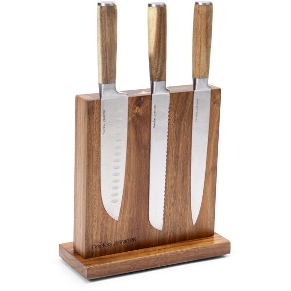 Smart, elegant og praktisk knivstativ laget i holdbar akasie. Stativet har to innebygde magneter som holder kjøkkenknivene smidig på plass - på begge sider. Ved å bruke et knivstativ holder du knivene skarpe og vasse lenger, og har dem dessuten alltid lett tilgjengelig når du lager mat.