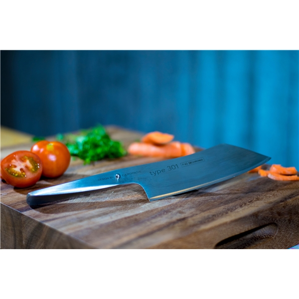 CHROMA type 301 P-40 Hakata Santoku – Den nye Hakata Santoku-kniven er en symbiose av Santoku og kokkekniven. Kniver med tre bruksområder for å kutte kjøtt, kutte fisk og kutte grønnsaker.