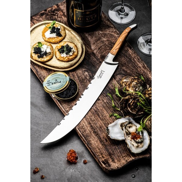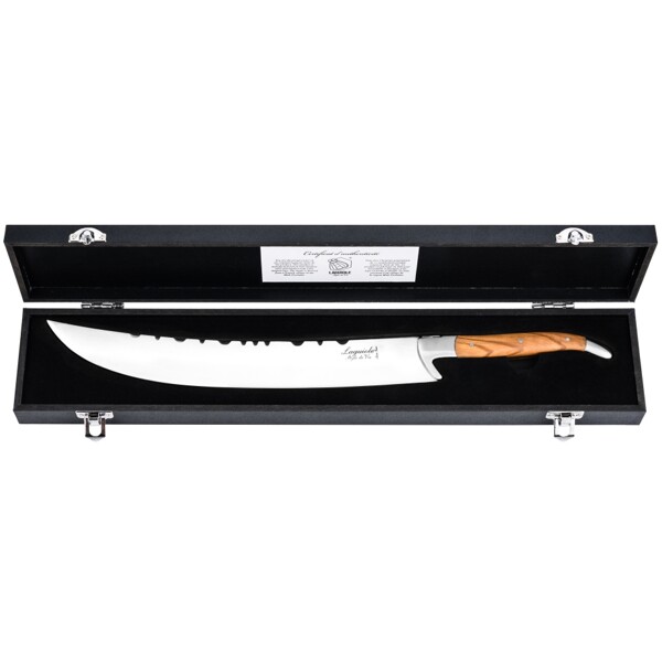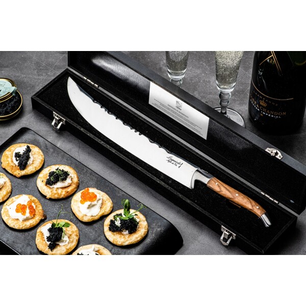 Champagnesabelen fra Laguiole Style de Vie gjør champagneåpningen til en fest! Sabelens blad er laget av herdet stål kombinert med et håndtak av oliventre. Sabelens blad har en tykkelse på 2,5 mm og tåler ikke oppvaskmaskin. Hver sabel er pakket i et luksuriøst svart etui.