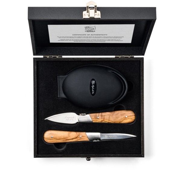 Dette østers-wenge-gavesettet med silikongrep gjør det å åpne østers virkelig til en lek! Dette settet består av 2 østerskniver og en silikongrep for å holde den på plass. Hvis du presenterer dette settet på en fest eller middag, vil du garantert imponere gjestene dine!