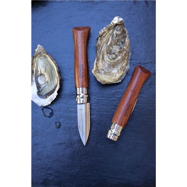 Østers- og skalldyrkniv, No9, 6,5 cmEn kniv som er spesielt framstilt for å åpne østers. Dens korte kraftige blad forserer lett østersens muskel og åpner den. Bladet er av Sandvik 12C27 stål med skaft i eksklusivt bubingatre.År 1890, i hjertet av de franske Alpene, ble den første Opinelkniven skapt av Joseph Opinel. Kniven ble raskt populær blant lokale bønder og vindyrkere og har siden den gang vært en trofast følgesvenn for såvel naturelskere, kokker, gartnere, fjellklatrere og sjømenn.Det miljøbevisste foretaket, nå basert i Chambéry i Frankrike, har blitt bevart innen familien og drives i dag av Joseph Opinels etterkommere. Foretaket har miljøfokus og er opptatt av å produsere kniver med hensyn til naturlige ressurser.Opinel er et symbol for fransk kultur og livsstil. Foretakets legendariske fellekniver har prydet lommene på verdens største eventyrere. Alpeguiden Roger Frison-Roche og fjellklatreren Savoyard, gjorde aldri en oppstigning uten å ha en Opinelkniv med seg og det var nettopp en Opinelkniv Picasso brukte til å skape sine skulpturer med.Nå for tiden framstiller Opinel også kjøkkenkniver og stekekniver i Opinels karakteristiske fargeskala. De har dessuten produsert kniver til spesielle arrangementer slik som 1998 FIFA World Cup i Frankrike og til Tour de France. Opinel vil at deres kniver skal føles som en naturlig forlengelse av den menneskelige hånden.