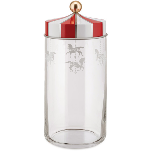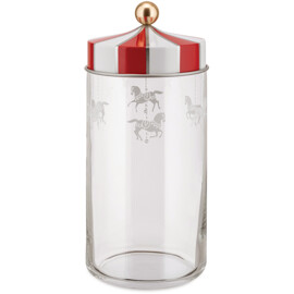 Design: Marcel WandersTillverkade i glas och erbjuds i fyra olika storlekar. 'Circus' -serieburkar med hermetiska lock används för att lagra olika matvaror, som då kan förvaras på ett bra sätt. Här hämtar Marcel Wanders inspiration från den fina dekorationen från cirkustältens stora topp. Locket är dekorerat med den traditionella röda färgen och med vita ränderna på mässingsmarkiser, resultatet är förtrollande. Wanders förvandlar klassiska köksburkar till glada, vackra förvaringsburkar som pryder köket på ett fantastiskt sätt.