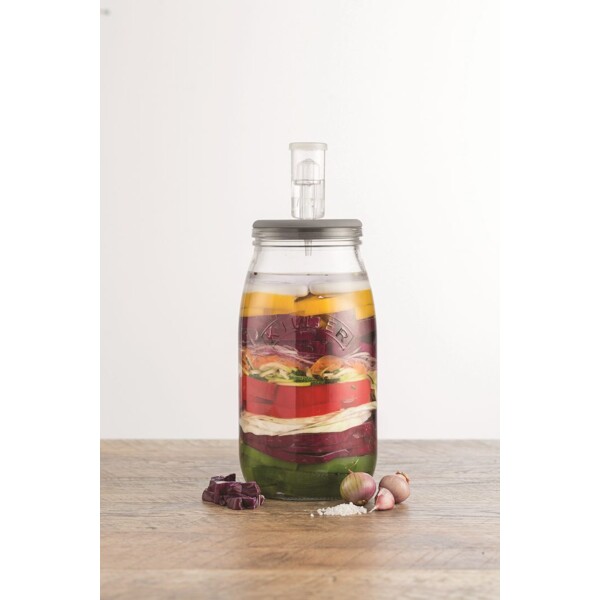 Design: KilnerKilner®-fermentasjonssatsen er en enkel måte å gjøre godt fermenterte matvarer fylt med vitaminer, mineraler og probiotiske kulturer. Perfekt for å lage levende kulturer av surkål, kimchi, pickles og mye mer. Å lage fermenterte matvarer er ikke noe problem, legg bare til dine favorittgrønnsaker, vann og salt. Oppskrift og beskrivelse ligger med i forpakningen. Rommer 3 liter. Ligger forpakket i en gaveforpakning.