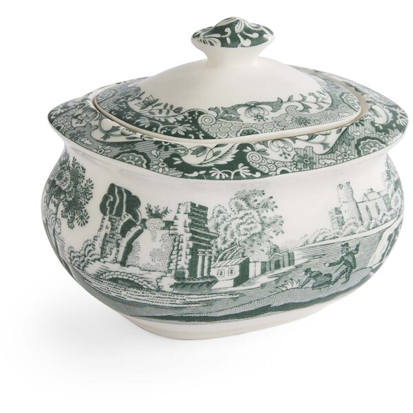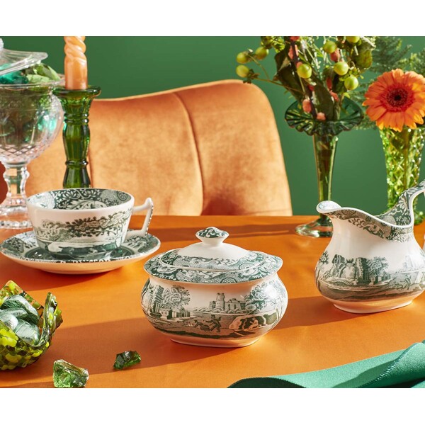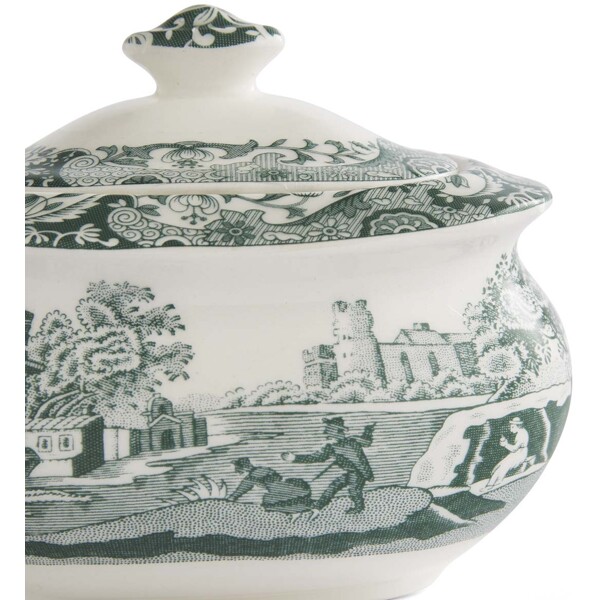 Heritage Green Italian Sukkerbolle med lokk 0,25 L er et sjarmerende tilskudd til te- eller kaffestunden. Med samme ikoniske motiv som Spodes klassiske Blue Italian – her i en elegant grønn nyanse – forener den tradisjon med oppdatert fargesetting og tidløs skjønnhet.Motivet er inspirert av det pittoreske italienske landskapet og er innrammet av det karakteristiske 1700-talls Imari Oriental-mønsteret som løper rundt skålens kant. Det praktiske lokket bevarer innholdet friskt, og skålens balanserte form gjør den både vakker og funksjonell på bordet.Produsert i Stoke-on-Trent, England – hvor britisk porselenskunst er blitt foredlet i generasjoner.