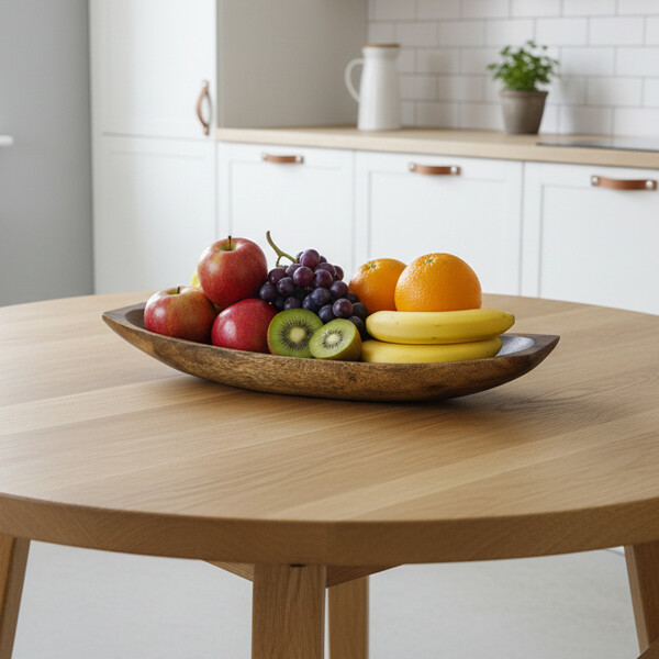 Ta inn varmen av naturlig tre og håndverksmessig dyktighet i ditt hjem med denne utsøkte håndlagde trebåtbrettet. Omsorgsfullt laget i Thailand, dens elegante, langstrakte båtform og glatte naturlige finish gjør den til et allsidig og vakkert tillegg til ethvert rom. Dette 100% håndlagde og miljøvennlige stykket er et bevis på ekte kunstnerisk dyktighet, perfekt for å forbedre din innredning med bærekraftig sjarm og praktisk bruk. Størrelse: Omtrent 20 x 51 x 7,5 cm Materiale: Laget av 100% naturlig tre. Håndlaget dyktighet: Hver vase er fullstendig håndlaget og gjennomgår en intrikat prosess med sliping, utskjæring, forming, utjevning og maling, noe som garanterer dens unike karakter og overlegne kvalitet. Miljøvennlig: Et dekorativt objekt fra Thailand som støtter miljøbevisst livsstil. Unik design: Har en grasiøs båtliknende silhuett med en naturlig trefinish, ideell for å tilføre organisk eleganse til din innredning. Bruksidéer: Dekorativ aksent: Forbedre ditt spisebord, salongbord eller konsollbord med denne elegante dekorative basen. Serveringsbrett: Perfekt for å presentere snacks, brød eller små appetittvekkere (for tørre varer). Oppbevaring: Organiser nøkler, post eller fjernkontroller i en entré eller stue. Organisert visning: Bruk den til å vakkert arrangere lys, dekorative sfærer eller personlige skatter.