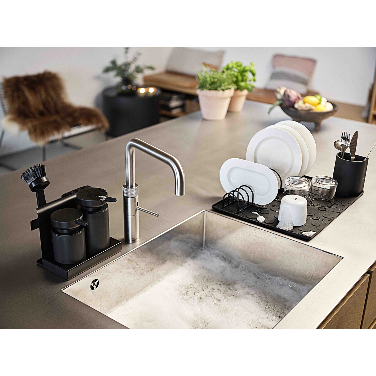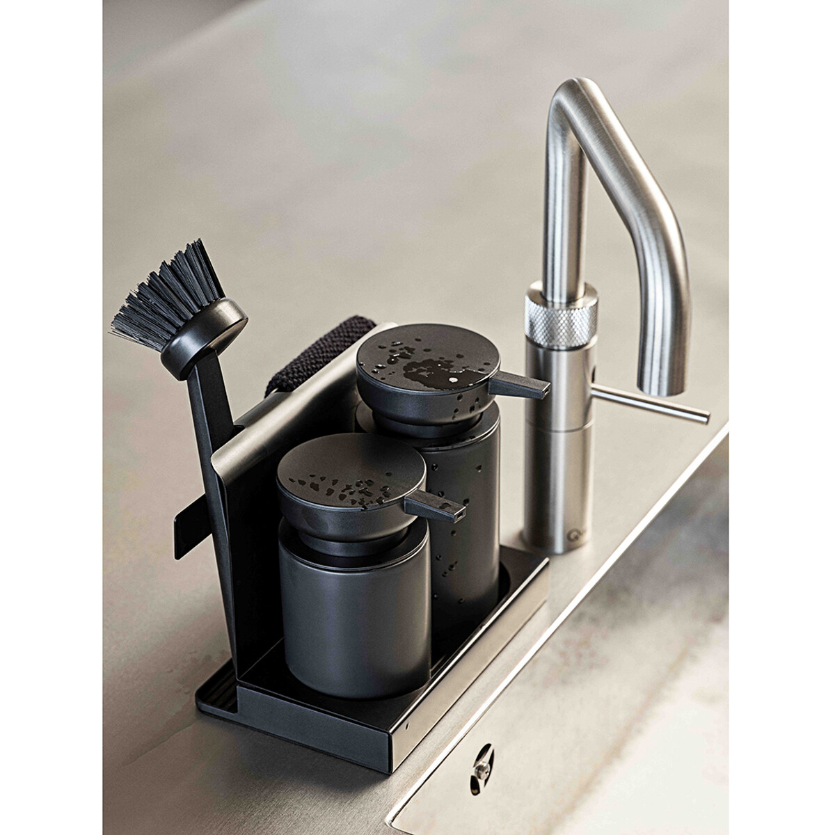 Foran står pumpe-duoen for oppvaskmiddel og håndsåpe/håndsprit. Begge er laget i keramikk. I bakgrunnen henger den strikkede oppvaskkluten til tørk diskret til den er klar til bruk. Som selskap har den en børste i matchende farge. En siste stilig detalj er den lille brettet som samler opp overflødig vann slik at det ikke havner på kjøkkenbordet.