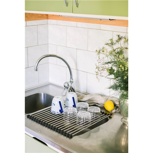 Bytt ut store oppvaskstativ i plast med stilige Dinas for elegant oppvask. Plasser den over vasken for å la serviset dryppe med stil.