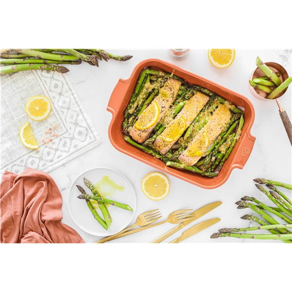 Rektangulær keramisk ovnsfat i terrakottafarge fra Peugeot. Denne ovnen er den perfekte løsningen for å lage et festlig spisebord hver dag med ovnsbakte måltider. Keramikk er det ultimate materialet for sunne, smakfulle måltider. Takket være den termiske tregheten som finnes i støpeformens høykvalitetsmaterialer, kan Peugeots keramiske ovnforme fra Appolia holde måltidene varme i opptil 30 minutter etter at du har forlatt ovnen. De forskjellige størrelsene på Peugeots Appolia-utvalg av ovnsformer kan stables sammen for å spare plass og muliggjøre enkel lagring. Finnes i flere størrelser og former.