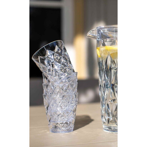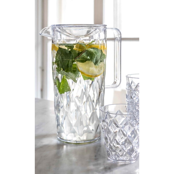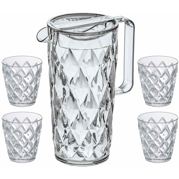 Stilig sett med CRYSTAL vannkaraff 1,6 liter og fire matchende glass. Karaffen og glassene tilhører den uknuselige plastglass-serien Superglas fra Koziol, laget i 100% resirkulerbar og giftfri termoplast. Økovennlig design og produsert i Tyskland.