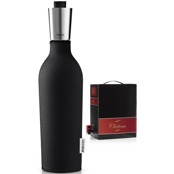 Design: Eva Solo Eva Solos Vinkaraffel er passende for servering av f.eks. bag-in-box vin. Den garanterer en elegant servering av vin og er dryppfri. Den rommer det samme som en flaske vin. Det isolerende neopren overdraget holder din drikke kalt. Karaffelen er lett å fylle og med den praktiske silikonproppen beholder du all drikke i karaffelen ved transport.