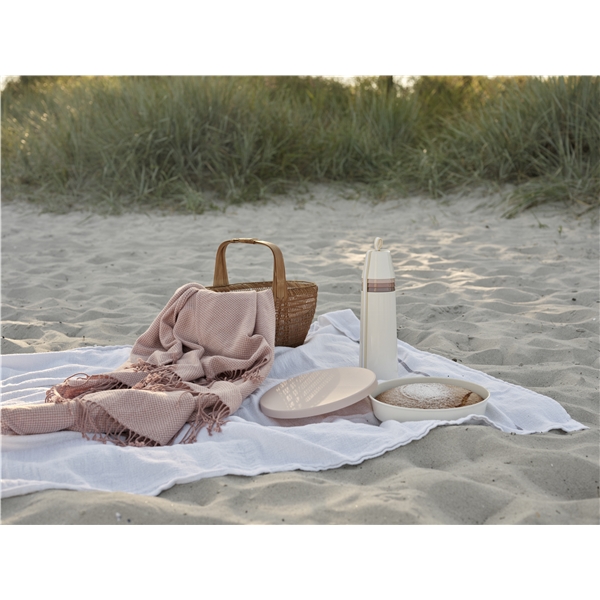 PICNIC termosflaske og kopper er perfekte for stranden eller i skogen og holder kaffe, te, varm sjokolade eller juice varm eller kald i lang tid. Termosflasken rommer 1 liter væske og er utformet med doble vegger i stål med vakuum som sørger for at væsken kan holde seg varm i 11 timer eller kald i 22 timer. Skrukorken holder flasken helt tett. De medfølgende koppene kommer i 4 forskjellige fargetoner slik at det er lett å huske hvem som har drukket av hvilken kopp. Koppene er laget av PBT-plast og går derfor ikke i stykker hvis du mister dem. De kan vaskes i oppvaskmaskin. Både flasken og koppene har også en helt blank overflate slik at smuss ikke fester seg så lett. Når settet ikke er i bruk kan koppene stables og legges oppå termosen som lokk og delene holdes sammen med en gummistrikk. Et hakk i bunnen av termosflasken og koppen holder gummibåndet på plass.