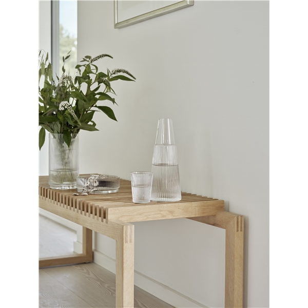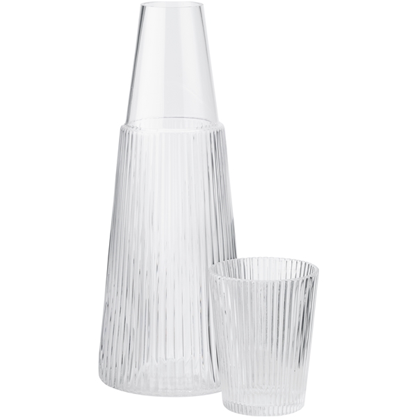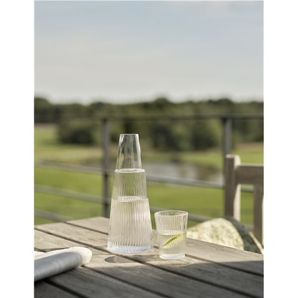 Pilastro karaffel med drikkeglass fra velkjente Stelton har et fantastisk kjegleformet design med ribbet overflate. Karaffelen og drikkeglasset er, akkurat som de andre delene i serien, designet av Francis Cayouette, som har latt seg inspirere av både den praktiske og tidløse Art Deco-stilen på 1920-tallet. Pilastro-serien tåler både varme og kalde drikker og kan kombineres med hverandre 1 karaffel: Høyde 27 cm, Ø10,5 cm, volum 1 liter 1 drikkeglass: Høyde 9 cm, Ø7 cm, volum 20 cl Vedlikeholdsråd Tåler oppvaskmaskin.