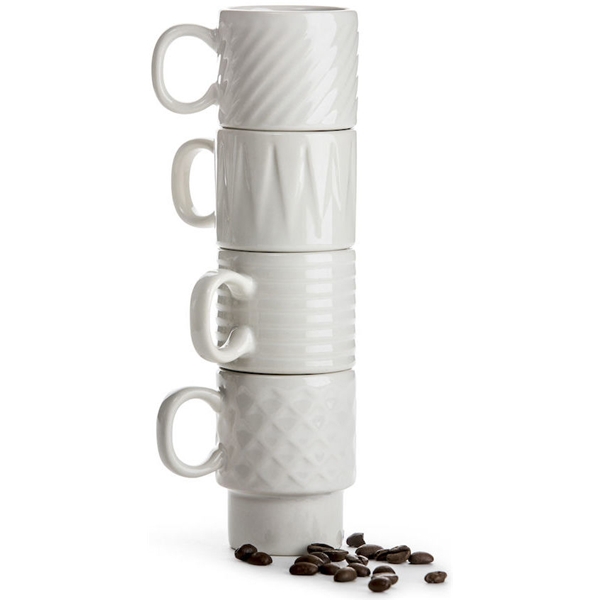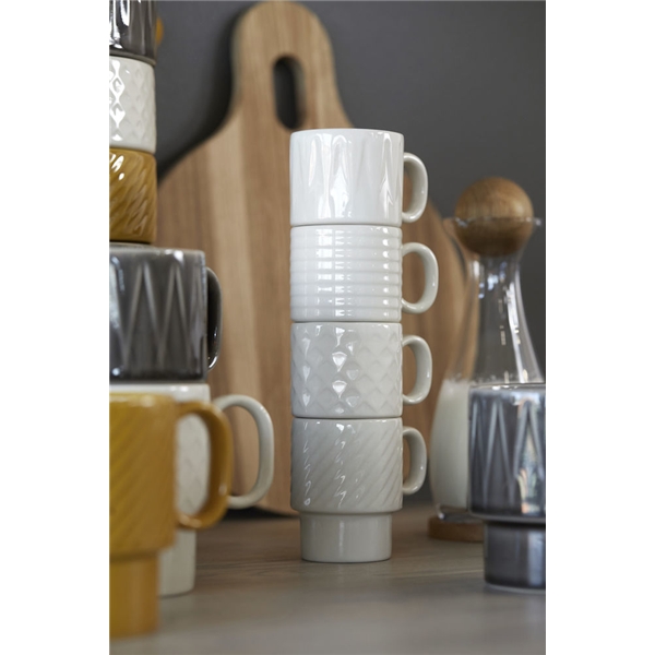 Espressomugg 4-pack med karakteristisk relief. Espresseomuggen er en del i serien Coffee & More, laget av Sagaform i samarbeid med designeren Margot Barolo. Seriens design er en flørt med 70-tallets direkte, lekefulle og strake språk. Serien finnes i ulike deler, mønster og farger og gjør seg aller best i en herlig blanding av alt! Tåler mikrobølgeovn og maskinvask. Fungerer som espressomugg men også perfekt som gløggmugg.